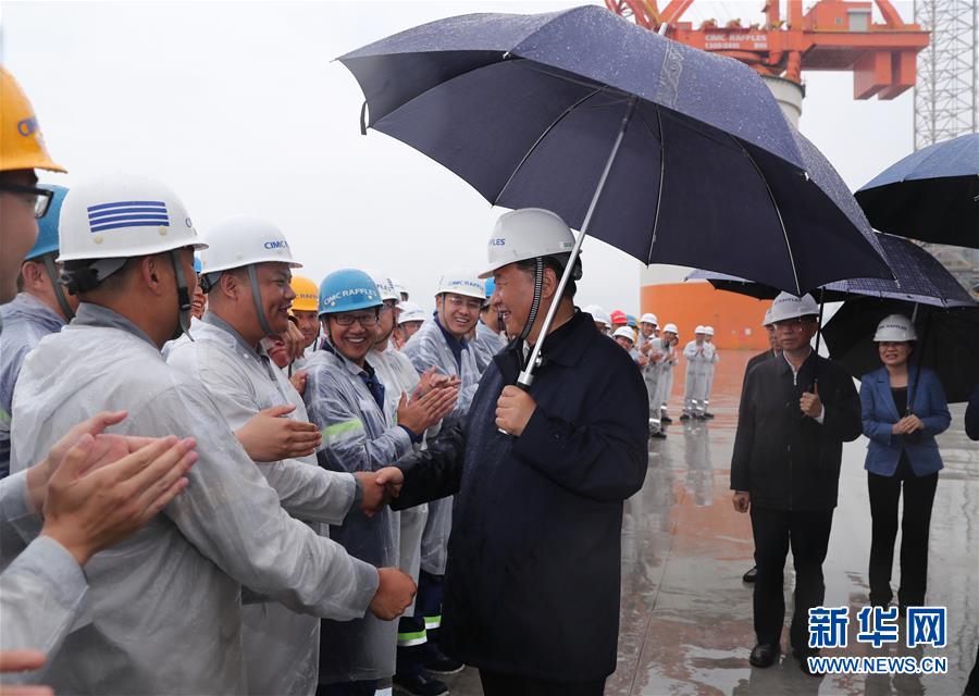 风急云低,雨流如注。13日下午,习近平来到中集来福士海洋工程有限公司烟台基地。作为国内率先进入海洋工程行业的企业,中集来福士用10年左右时间,国产化率从不足10%提高到60%。在厂区码头上,习近平撑着雨伞,趟着积水,近距离察看停靠在这里的自升式修井生活平台,远眺“蓝鲸1号”超深水双钻塔半潜式钻井平台、“泰山”龙门吊、海洋牧场平台,向企业负责人详细了解高端海洋工程设备制造、维护、运行情况。海风吹起了衣襟,雨水打湿了裤腿。习近平站在雨中,同围拢过来的工人们一一握手、亲切交谈,向作业平台上的工人们挥手致意。习近平指出,国有企业特别是中央所属国有企业,一定要加强自主创新能力,研发和掌握更多的国之重器。国有企业要深化改革创新,努力建成现代企业。要坚持党对国有企业的领导不动摇,坚持建强国有企业基层党组织不放松,为做强做优做大国有企业提供坚强组织保证。